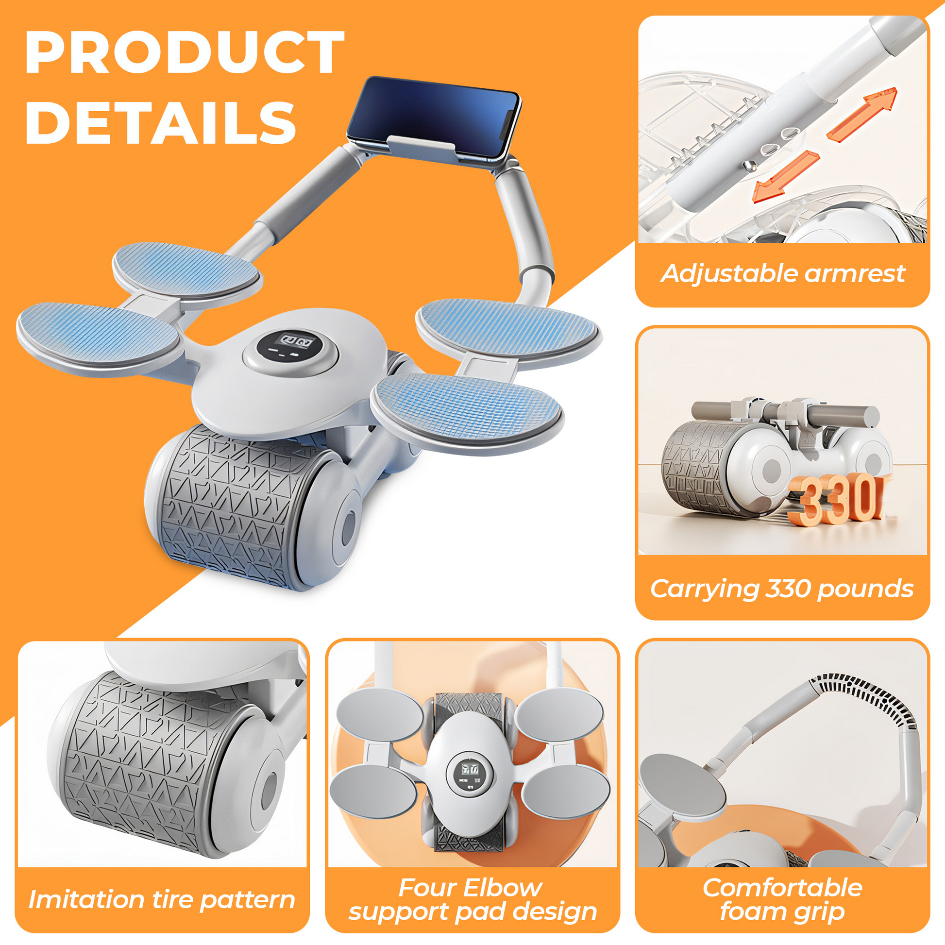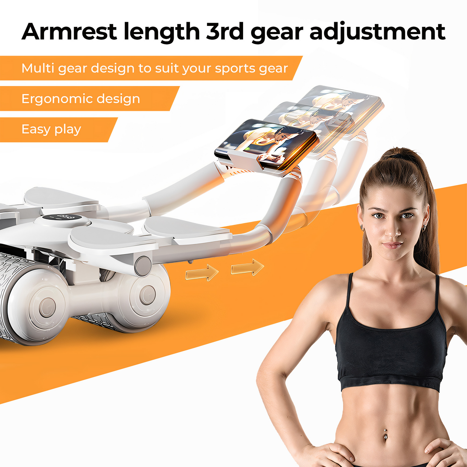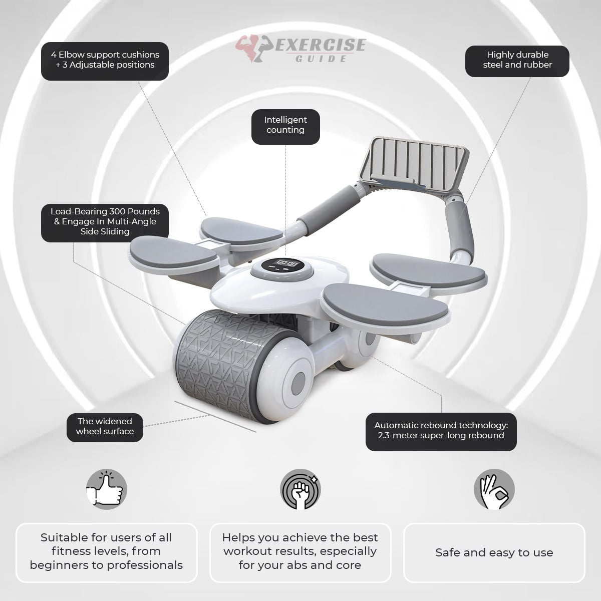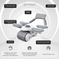 The Ab Roller features a unique design with curved, padded handles and 4 padded elbow rests, ensuring comfort and reducing wrist and shoulder strain. Its wide, rubber-coated wheel provides smooth, stable rolling on any surface, enabling a more effective and comprehensive core workout.